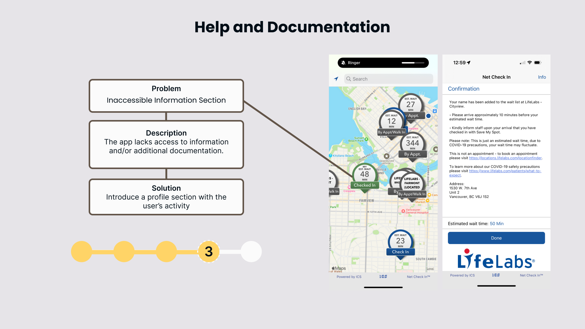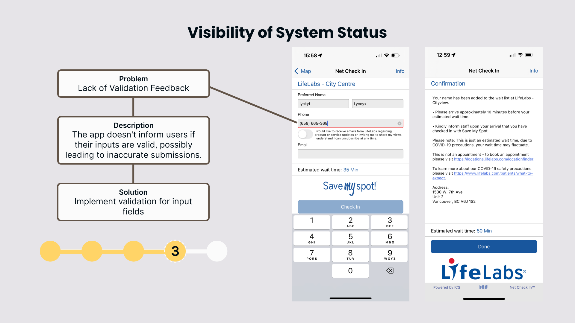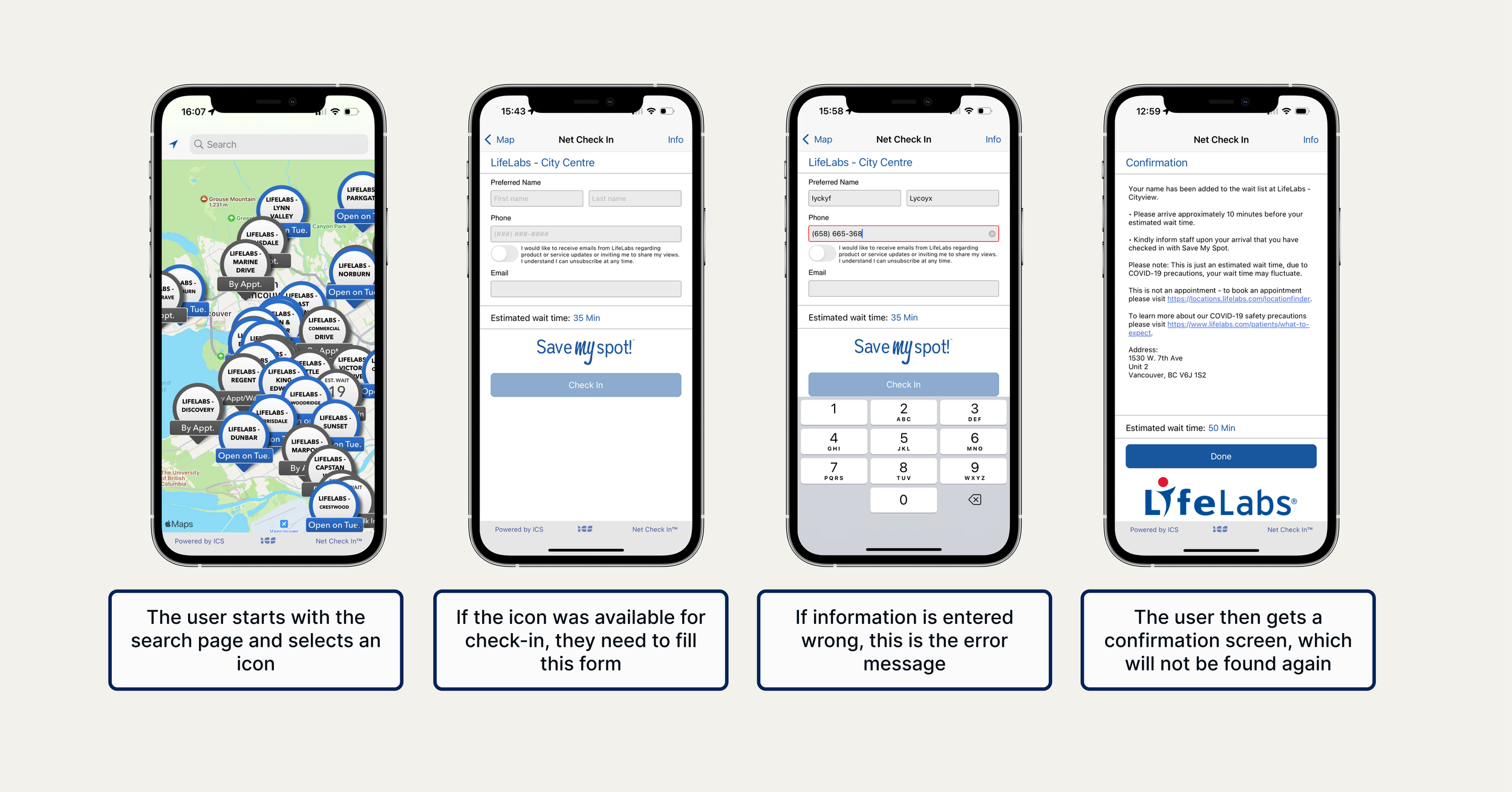 A heuristic evaluation of Lifelabs save my spot app was conducted. In a team of 2, we improved the usability of the Save my Spot app to increase bookings through the app and decrease crowding and wait times for patients.