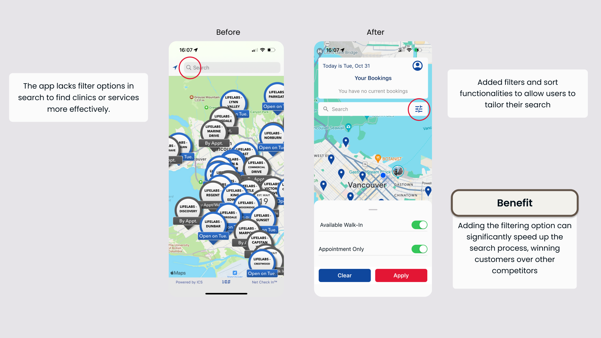 By updating the app’s icons for consistency and improving navigation, LifeLabs could significantly enhance the user experience and its brand image. Adding smart search filters would make finding information fast and simple. These proposed improvements aim to make the app more user-friendly and appealing as a modern healthcare provider. Implementing these changes could lead to increased user engagement and retention, positioning LifeLabs to expand its market presence and boost revenue effectively. This project demonstrates how thoughtful design enhancements could bring substantial benefits to both users and the business.